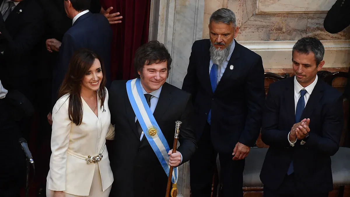 El líder de La Libertad Avanza realizó el juramento frente a Cristina Kirchner, que encabezó la Asamblea Legislativa, y luego recibió la banda y el bastón de manos de Alberto Fernández