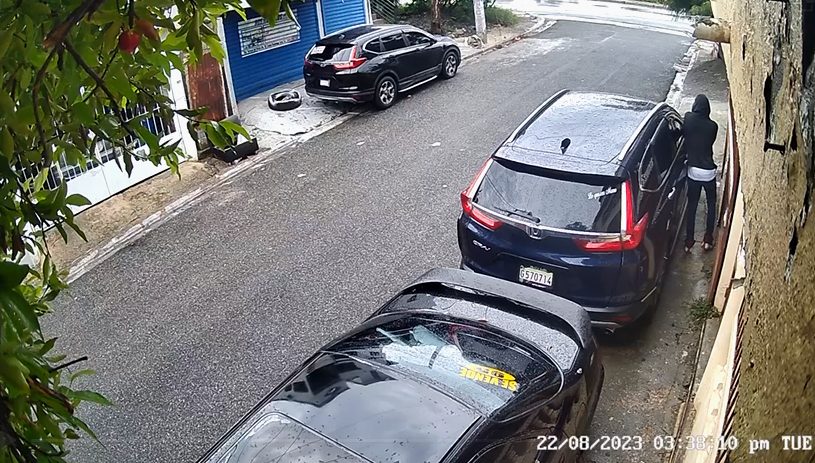 El momento quedó captado en una cámara de seguridad, donde se le observa al hombre sustraer los retrovisores de una jeepeta, en la calle Juan Pablo Duarte esquina Ecológica, urb. Paraíso Oriental, Santo Domingo Este.